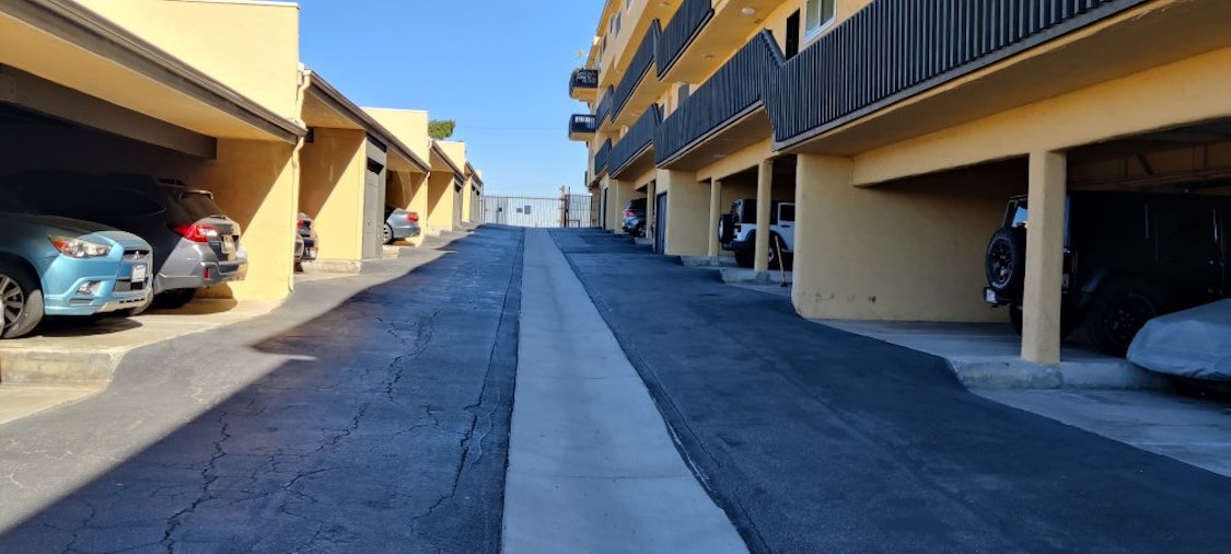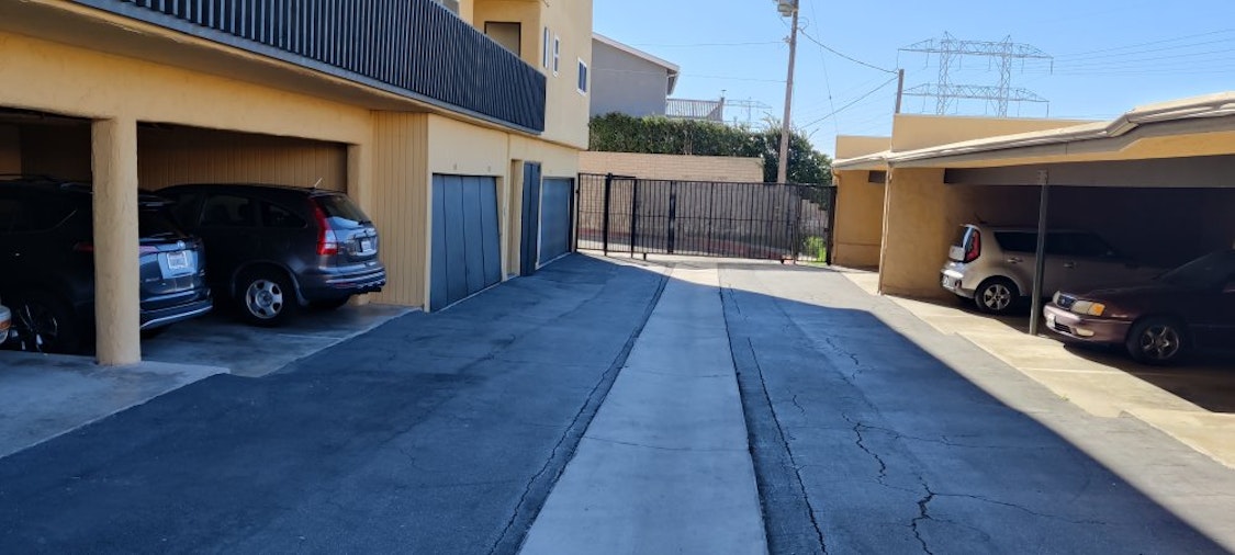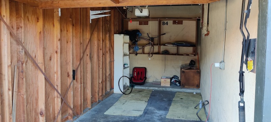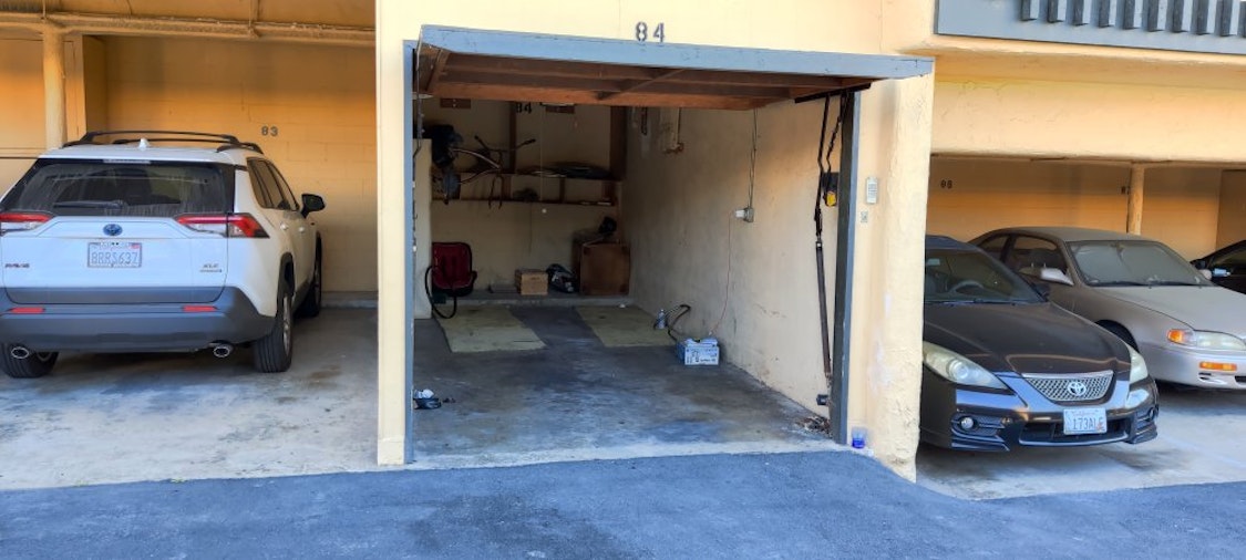 Single car garage clean with lights and working outlets. Also has shelves for storage and hooks for bikes and or surf or boogeyboards. It's inside a gated carport with a garage door in a very safe neighborhood