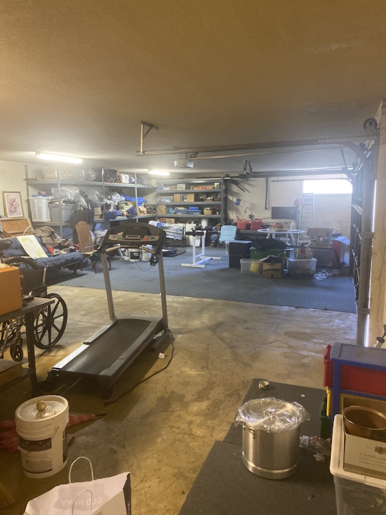 Three car garage with storage space working area.