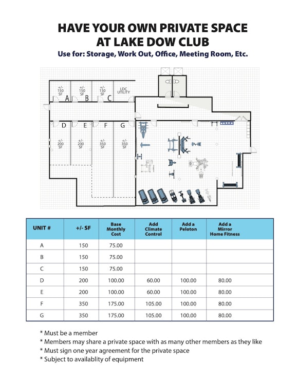 We offer private spaces to be used as storage. These are located on the 3rd floor of a private club, with elevator, in McDonough. Climate control may be added. Our private flexible spaces may be used as: Storage, Work Out, Office, Meeting Room, Etc... Built to suit.