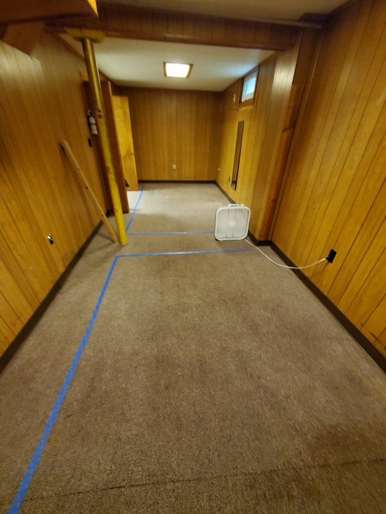 This is the smaller half of my climate controlled basement. Blue tape denotes space size. Nothing illegal or flammable, etc. Normal ceiling height. All site visits must be coordinated with home owner. Safe, quiet neighborhood.