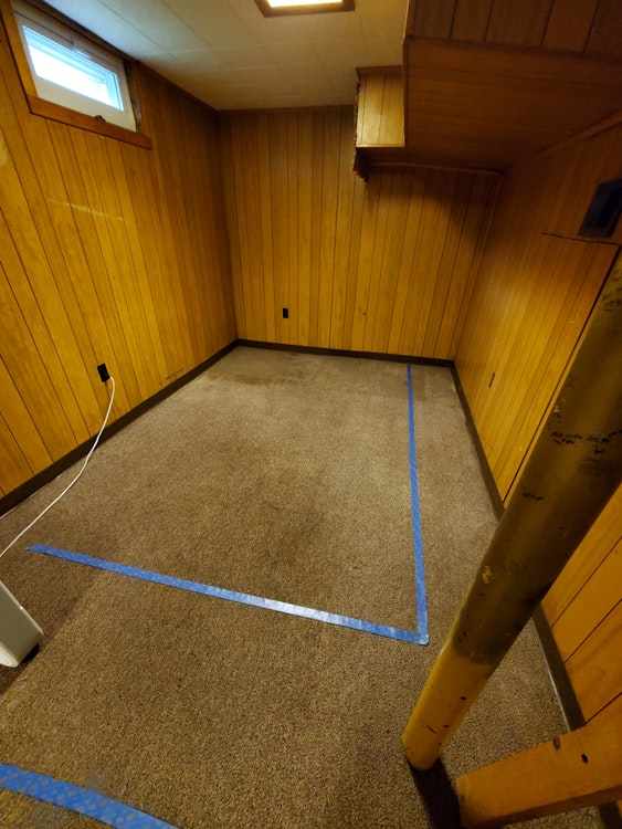 This is the smaller half of my climate controlled basement. Blue tape denotes space size. Nothing illegal or flammable, etc. Normal ceiling height. All site visits must be coordinated with home owner. Safe, quiet neighborhood.