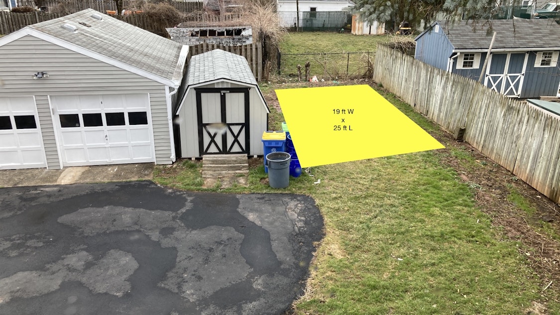 19 ft Wide x 25 ft Long unused outdoor backyard space. Great if you need to park a small vehicle (i.e., small boat, small trailer, short RV, ice cream truck, etc.) for a few months at a time.