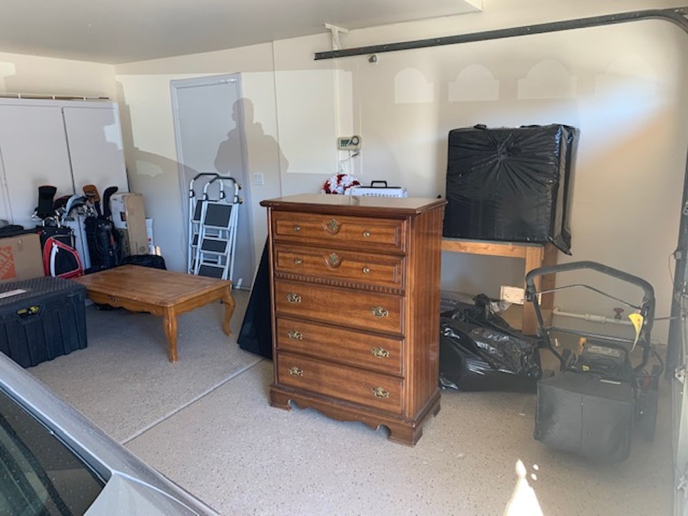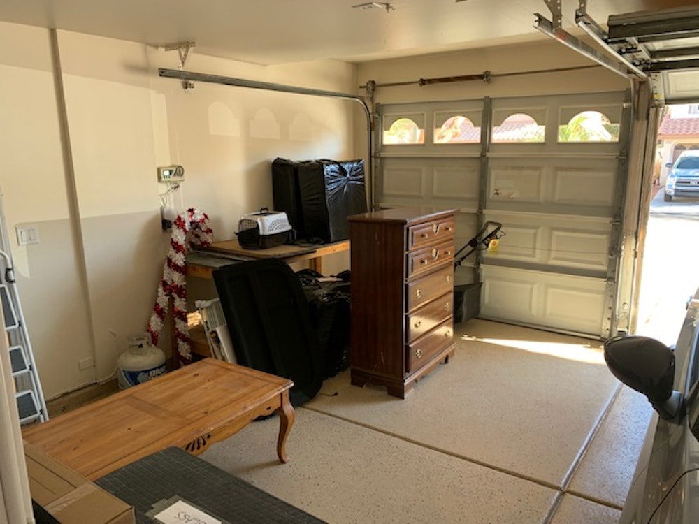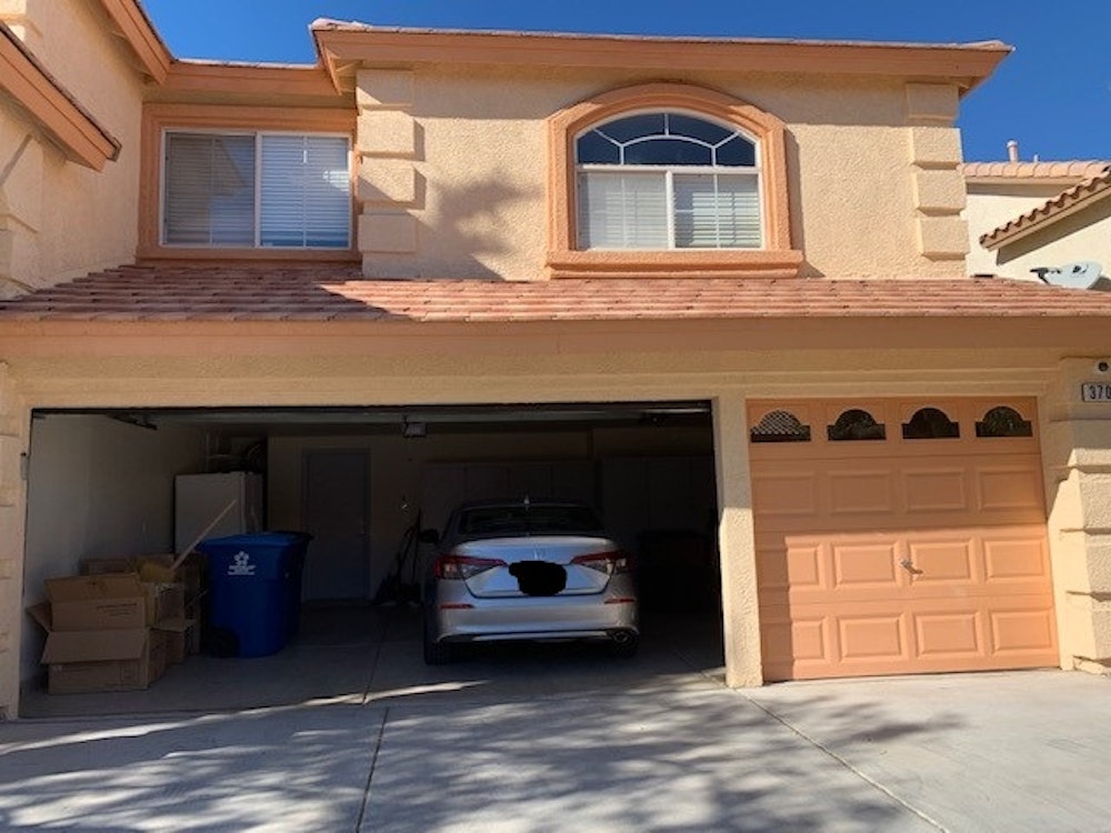 1-car garage available for any storage purposes. Should be able to fit a vehicle. If vehicle does not fit, I don't mind keeping my vehicle outside and storing in 2-car garage side. There is a workbench and some cabinet storage available. The garage is clean and has a security camera watching at all times.