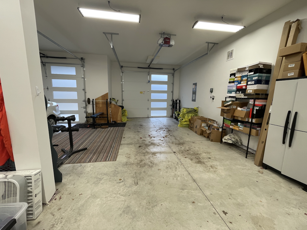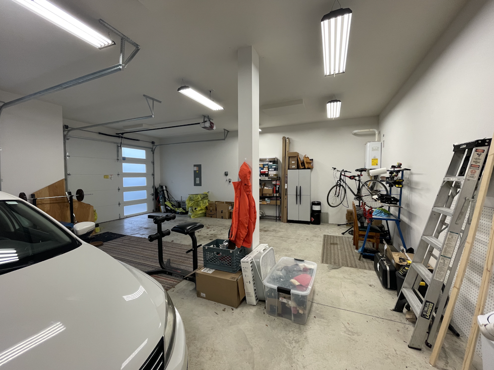 It's a larger than normal garage with an extra space and a lot of room around the parking space. I have an outlet for an electric car and a few other outlets around. There's plenty of room that I'm not using. I have an extra garage door opener and a code to enter. There's a security camera as well.